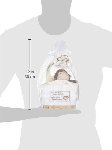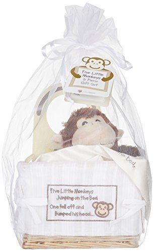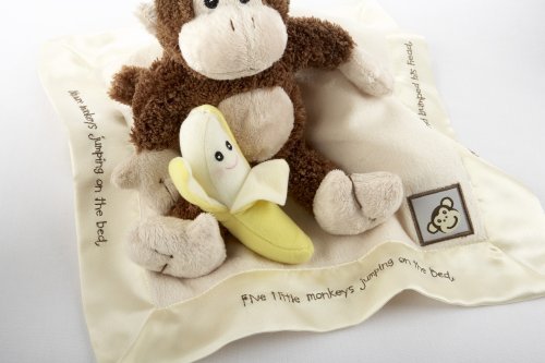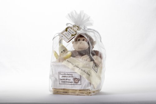 Adorable Gift – A sweet gift basket that any mother-to-be will love, this adorable monkey themed gift set is perfect for baby showers Monkey and Rattle – Plush 8 inch monkey with embroidered face is a friendly buddy for baby, and soft 5 inch banana shaped rattle is fun and cuddly Soft Blankie – 13 inch by 13 inch velour blankie with satin trim and Five Little Monkeys embroidery