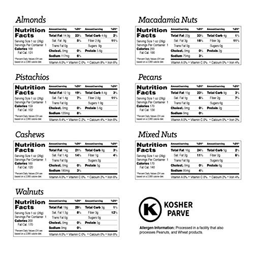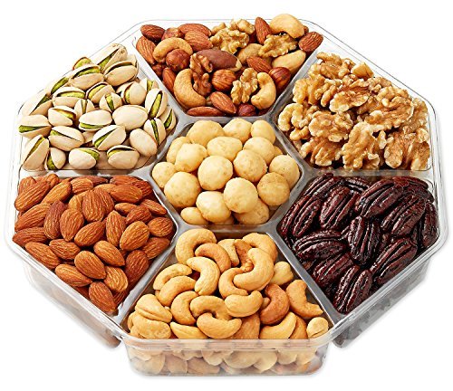 OVER TWO POUNDS OF DELICIOUS NUTS: All nuts that made it into this gift tray were hand selected for quality and freshness. The resulting ensemble is a delightful variety of gourmet treats that will please the most discerning pallet. Nuts baskets contains = Roasted salted macadamia nuts Almonds Pistachios Cashews Mixed nuts Raw walnuts and Honey glazed pecans.