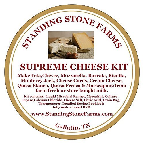 STANDING STONE FARMS SUPREME KIT is the Perfect Gift for all ages! Explore History, Science, Culinary and of course, delicious cheese! This ready to gift kit contains all the ingredients (except the milk & cream), Two-Hour Fully Instructional DVD, Thermometer & Drain Bag and even a few of our favorite spices so that you can make 100’s of cheeses using both cow, goat and sheep milk. Use farm fresh raw or store bought pasteurized!! Easily Make fresh, wonderful Feta, Mozzarella, Halloumi, Burrata, Ricotta, Monterey Jack, Chèvre, Goat Cheese, Cheese Curds, Cream Cheese, Butter, Cultured Butter, Quesa Blanco, Quesa Fresca and…