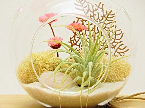 Complete kit includes everything as shown and will include the following:Includes the following: 1 – Round Glass, 4″ -And- Teardrop Glass, 7″ 1 – Air Plant 1 – Coral Sea Fan 1 – Rose Quartz Stone 1 – Natural Sand – Pink flowers (artificial) – Cream Reindeer Moss (preserved) – Twine – Assembly/Care Sheet