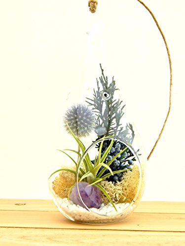DO IT YOURSELF- Complete kit includes the following: 1- 7″ Teardrop Glass 1- Air Plant “Ionantha” 1- Purple Amethyst Crystal 1- Dried Thistle Flower – Mini White Rocks – Juniper (preserved) – Natural Reindeer Moss (preserved) – Twine – Assembly Instructions/Plant Care Sheet