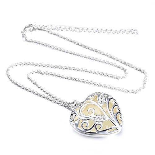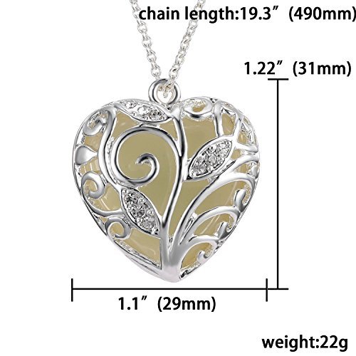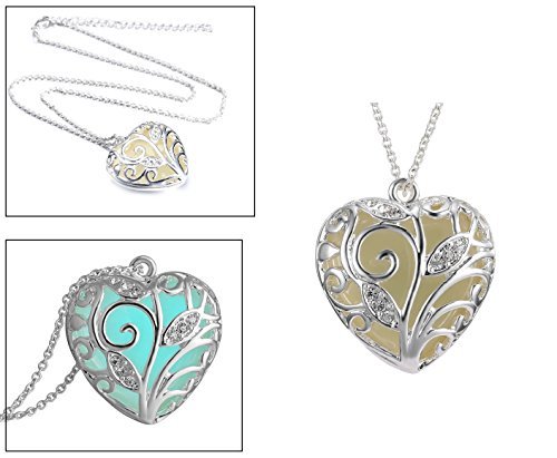 This is a beautiful, silver plated heart shaped pendant which shows a gorgeous aqua glow in the dark. The glow in the dark resin and the glowing crystals need light to charge. The stronger the light is and the longer it’s left under the better and longer-lasting the glow will be. The delicate, beautiful metal work is supported by the solid core making it a substantial piece. It’s beautiful in the daylight, but absolutely lovely when it starts to glow. Chain Length: 17.5, Pendant: 1.22″. Comes with complimentary gift box!