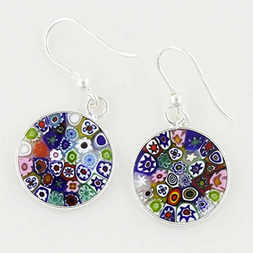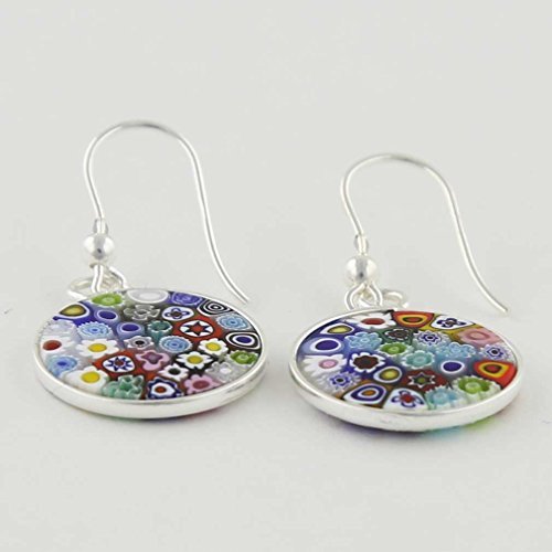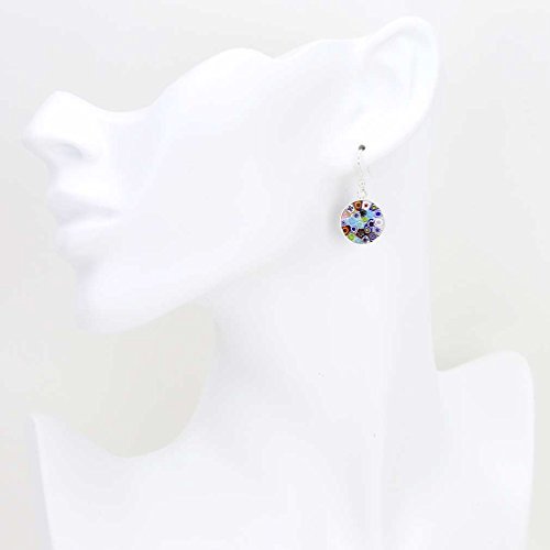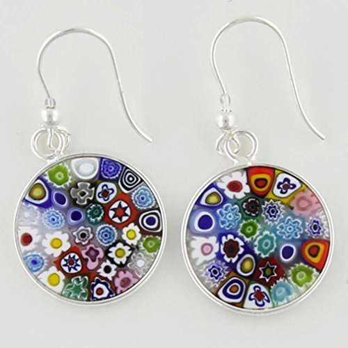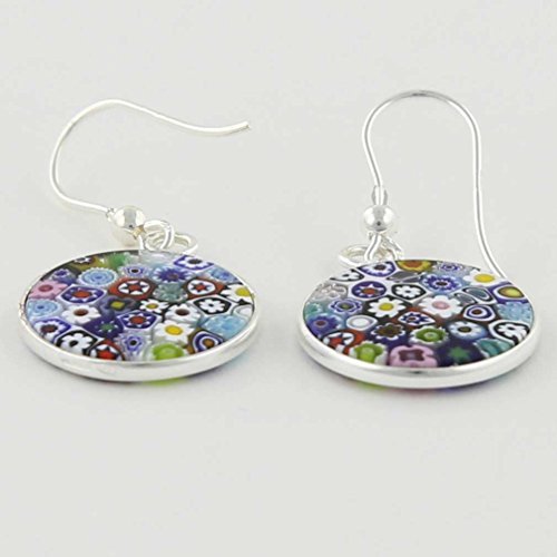 Millefiori Glass Round Dangle Earrings”Multicolor” Flower – Silver – Murano Glass Fashion Earrings For Women