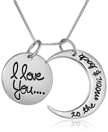 Sterling silver necklace featuring two-piece moon pendant engraved with loving message of “I love you…to the moon & back”
