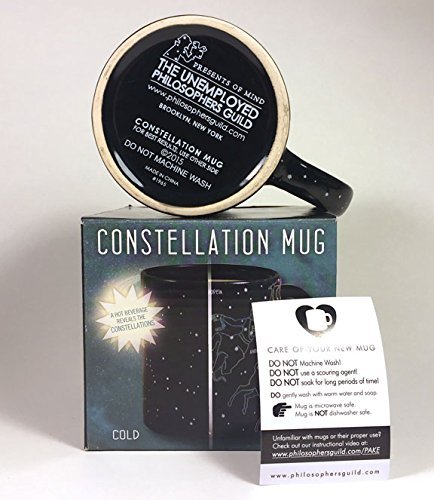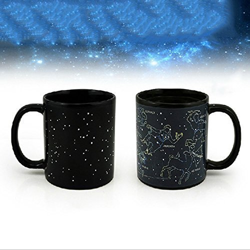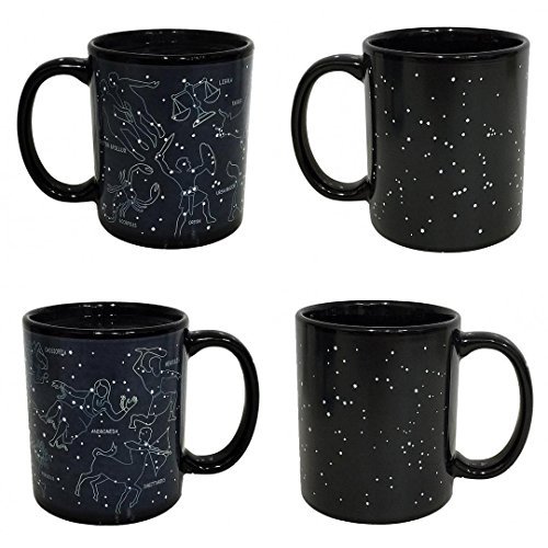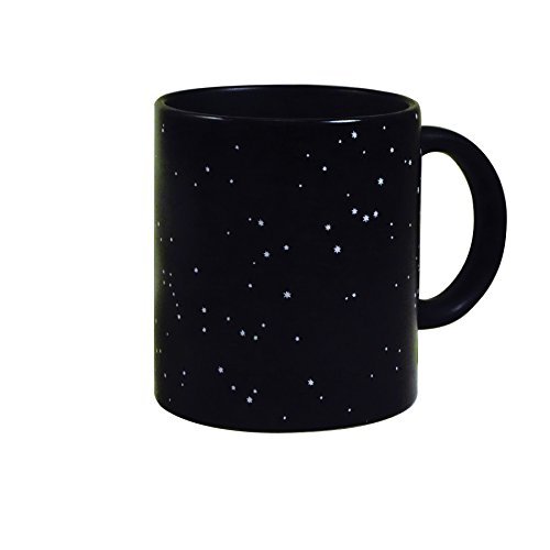 Starry night…. Pour a hot cup of coffee and 11 constellations emerge before your eyes. 10 ounce cup Microwave safe, not dishwasher safe. Includes: Cassiopea, Perseus, Sagittarius, Hercules, Andromeda, Scorpius, Taurus, Ursa Major, Ursa Minor, Orion, Castor Pollux
