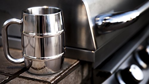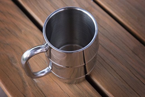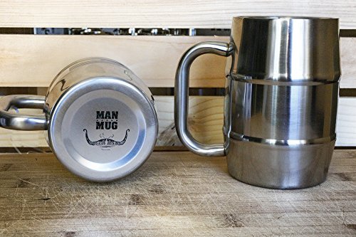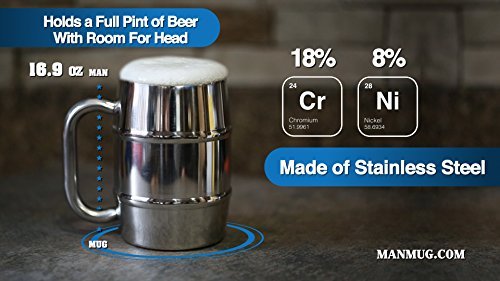 The Man Mug is a stainless steel double walled beer mug, coffee mug or cocktail mug. It’s made of kitchen grade 18/8 stainless steel. It’s double walled, meaning there’s a layer of air inside acting as a natural insulator. This means that the heat from your hand doesn’t transfer to your cold beer, or the heat from the coffee in the mug doesn’t burn your hand. it also means it won’t condensate, so there’s no need to use a drink coaster. It keeps your cold beer colder for longer and your hot coffee or cocoa nice and warm. It’s dishwasher safe and can be placed in the freezer until you’re ready for a nice cold beer. The large handle feels good in your hand and you look great holding it! It’s perfect for birthday gifts, Father’s Day gifts, groomsman gifts or just to say thanks.