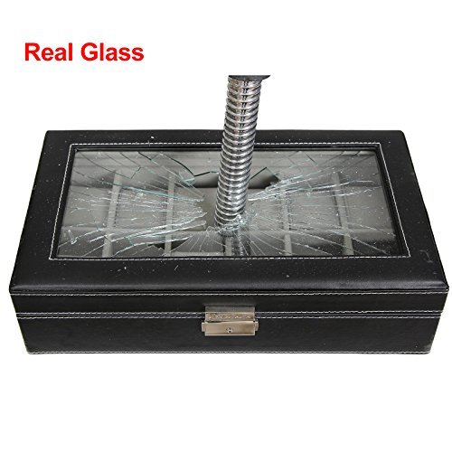 SONGMICS Black Leather Watch Box is great for personal use, shop display and home decoration. What a great way to not only display your jewelry but also save time in the morning. Real glass top provides you with better view to choose your beloved jewelry. The lid has a metal hinge attached to keep it from falling back. Metal lock with keys makes sure of safety. This is a nice showcase and works well to keep your watches, necklaces, bracelets, rings, earrings safe and organized. Nice gift idea for girls, boys, women and men.