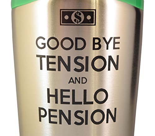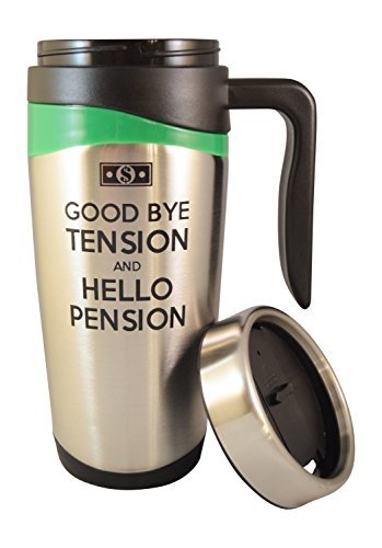 Show the soon to be retired boss, dad or mom in your life what to look forward to with the Good Bye Tension, Hello Pension Stainless Steel 16 Oz Double Wall Insulated Travel Mug Tumbler with Black Handle. The double wall body allows their drink to stay insulated at a perfect temperature and comes with a spill proof plastic screw-on lid. The black handle and green accents provide a stylish touch to the standard mug. With a curved steel body and padded bottom for slide protection, this mug is great for the soon to be relaxing retiree!